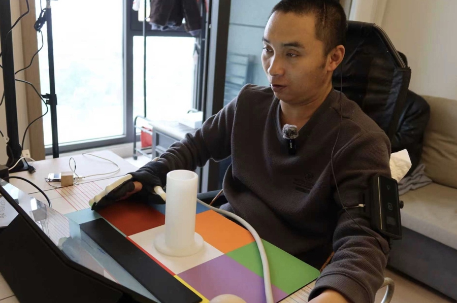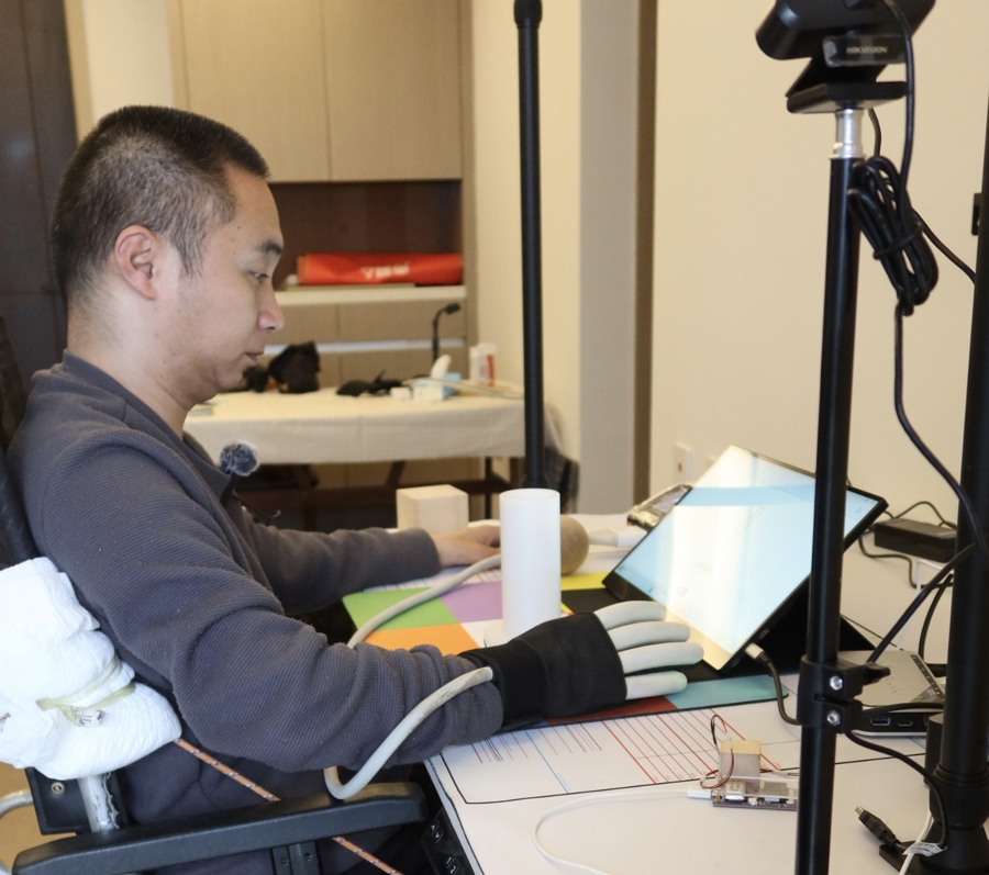 这样的训练,小董一天要做两次,每次2小时:反复通过意念让大脑释放抓握、放松的神经信号,驱动手套完成九宫格训练;将抓握物在9个不同颜色的格子间按要求移动,每次完成3轮共27组动作。