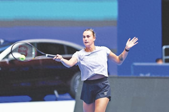 10月3日上午,萨巴伦卡在武网中央球场训练。(组委会供图)
